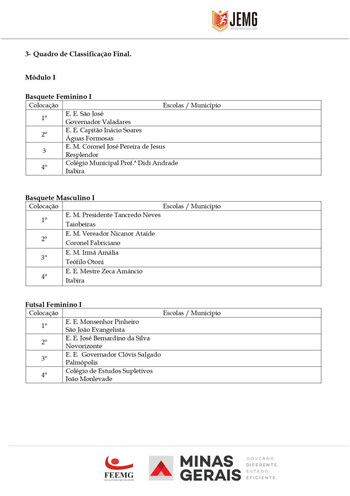 Foi finalizada a etapa regional do JEMG em Caratinga. Confira a lista da classificação final das partidas:
