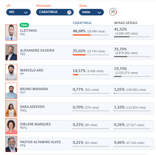 CARATINGA – Com 19.099 votos (48,68%), Cleitinho (PSC) foi primeiro colocado nas urnas de Caratinga. Ele superou Alexandre Silveira, que recebeu 13.740 votos (35,02%). Marcelo Aro ficou em terceiro lugar, com 5.638 votos (14,37%).