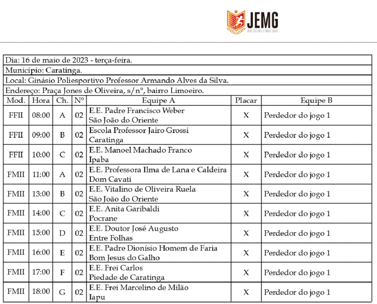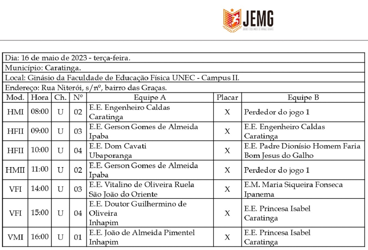 CARATINGA- Teve início nesta segunda-feira (15), a etapa microrregional do JEMG/2023 em Caratinga. 42 escolas, representando 21 municípios da região, competem nas modalidades de basquete, futsal, handebol, vôlei e xadrez, com 143 jogos previstos.