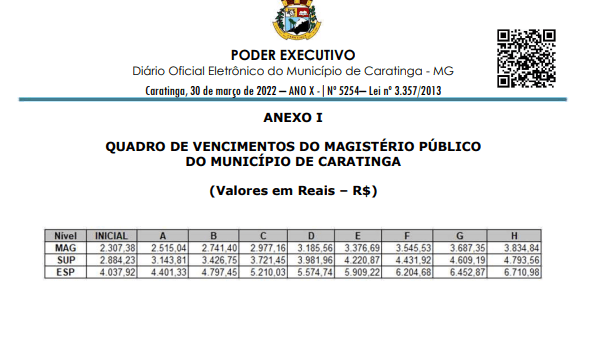 CARATINGA- Após aprovação na Câmara de Caratinga, foi publicado na edição de quarta-feira (30/3) do Diário Oficial Eletrônico do Município de Caratinga a lei nº 3884/2022 que concede reajuste de 27,48% no piso salarial dos profissionais do magistério da rede municipal de ensino de Caratinga.