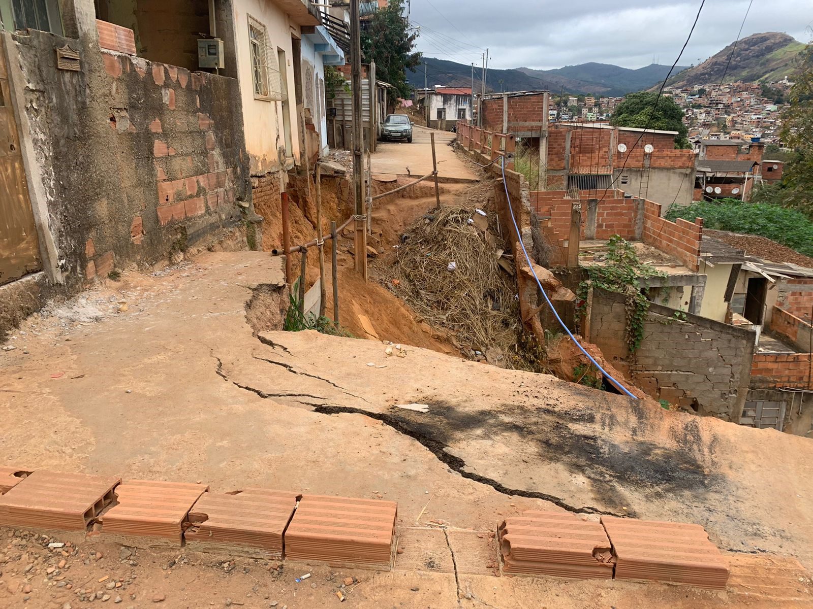 Após verificar o dano na estrutura do muro, a Defesa Civil também observou o início de erosão do asfalto da Rua José Trindade Bento com trinca no meio da via de aproximadamente seis metros de comprimento. Posteriormente, parte da rua desabou. Além disso, quatro residências ao redor apresentaram rachaduras e fendas, com possibilidade de colapso por perda de solo em suas bases.