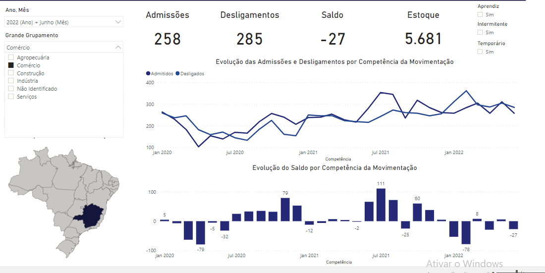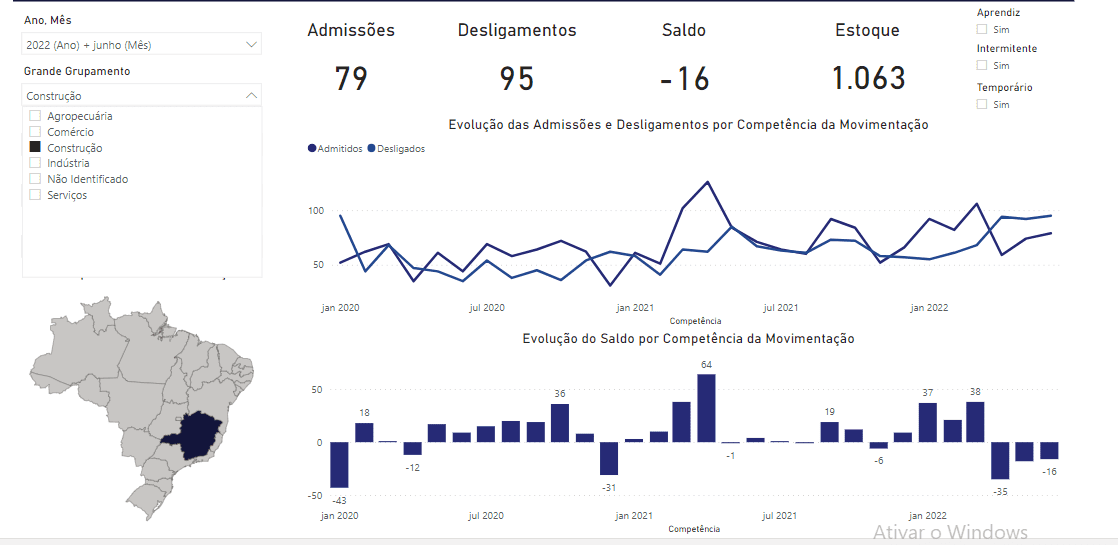 No acumulado do ano, foi registrado saldo de 1.334.791 empregos, decorrente de 11.633.347 admissões e de 10.298.556 desligamentos (com ajustes até junho de 2022).