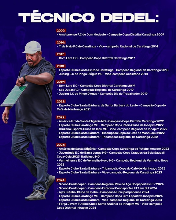 CARATINGA- Whederson José Lopes, conhecido como Dedel. Teve atuação destacada como goleiro, defendendo grandes clubes como Esplanada e Bairro das Graças. Nessa época já demonstrava espírito de liderança. Pendurou às luvas ainda jovem, mas, antes conquistou pelo Bairro das Graças, o título de 2008 defendendo o gol do Baleia. Era o início de uma nova jornada como técnico. Somente de 2009 até este ano de 2024 foram 25 conquistas com equipes lideradas por ele sendo campeãs ou vice-campeãs.
