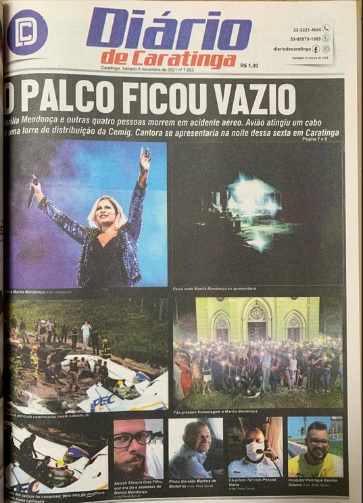 Em 6 de novembro de 2021, o Diário de Caratinga publicou uma das edições mais emocionantes de sua história, trazendo a capa que registrou a morte da cantora Marília Mendonça. “O palco ficou vazio” foi a manchete que expressou o luto de um país que, com o falecimento da artista, viu não só a música perder uma grande voz, mas também a cultura ser abalada por uma perda irreparável. A morte de Marília Mendonça deixou uma marca profunda, e o Diário, como sempre, foi a voz de toda uma comunidade que chorava a perda.