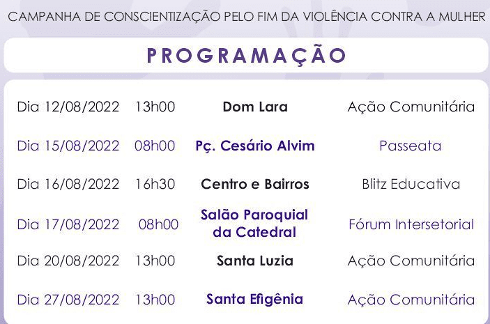 A secretária de Desenvolvimento Social Sara Cristina da Silva Araújo destaca os trabalhos que estão sendo realizados durante este mês. “Essa campanha tem desenvolvido ações nas escolas municipais e privadas, teremos ações nos distritos de Dom Lara, Santa Luzia e Santa Efigênia, teremos uma passeata também na Praça Cesário Alvim no próximo dia 15. As ações dos distritos, levaremos além da Campanha Agosto Lilás, todos os serviços da Secretaria de Desenvolvimento Social, Cadastro Único, parceria com a Secretaria Municipal de Saúde e o grupo Movimente”.