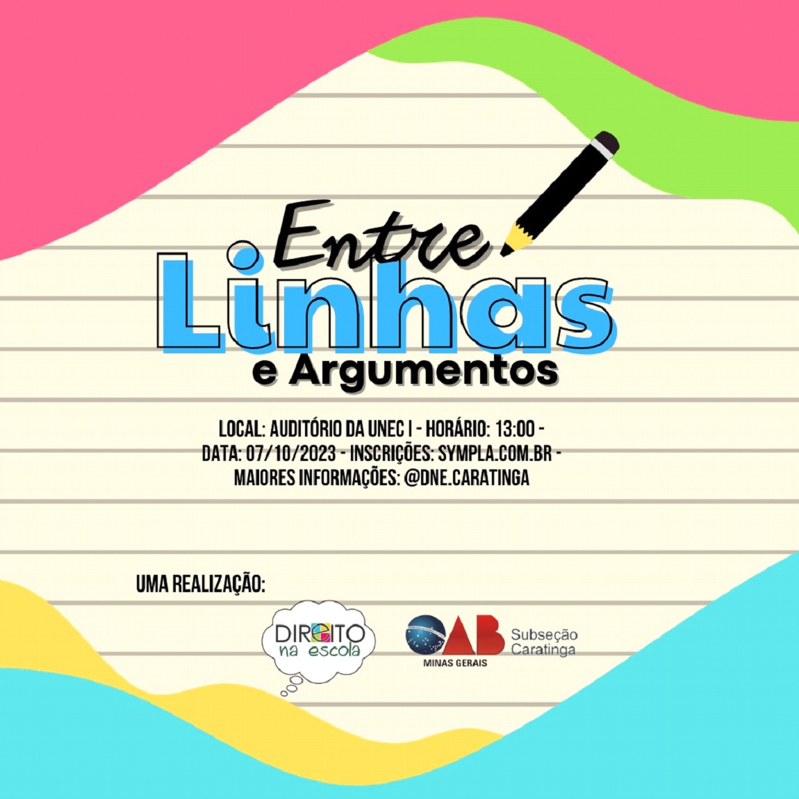 CARATINGA- Entre Linhas e Argumentos é um evento promovido pela Comissão Direito na Escola da 8ª Subseção OAB/MG – Caratinga, que tem como público-alvo os alunos do Ensino Médio que irão prestar o próximo Exame Nacional do Ensino Médio- ENEM. O evento acontece às 13h do dia 7 de outubro, no auditório do Unec I.