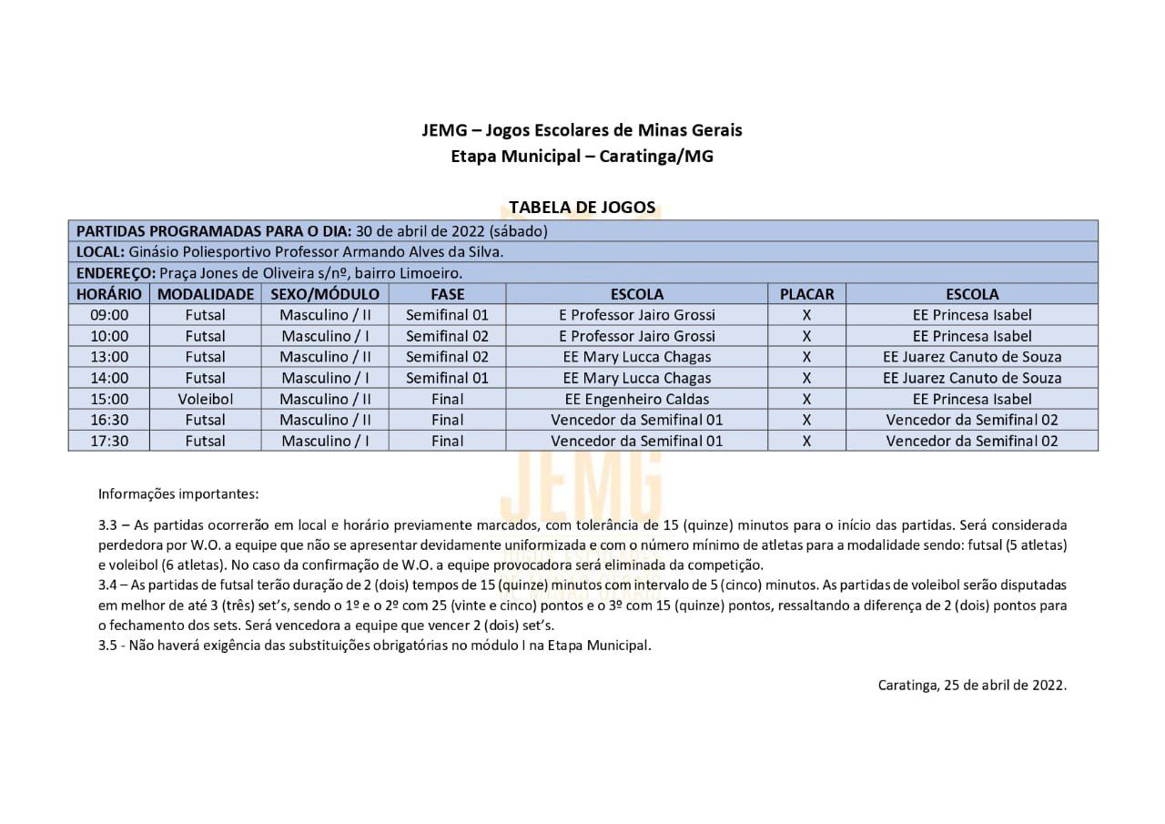 CARATINGA- Neste final de semana acontecerá a etapa municipal dos Jogos Escolares de Minas Gerais- JEMG. O evento será realizado no sábado, dia 30, a partir das 8h, no ginásio Poliesportivo (Bairro Limoeiro).