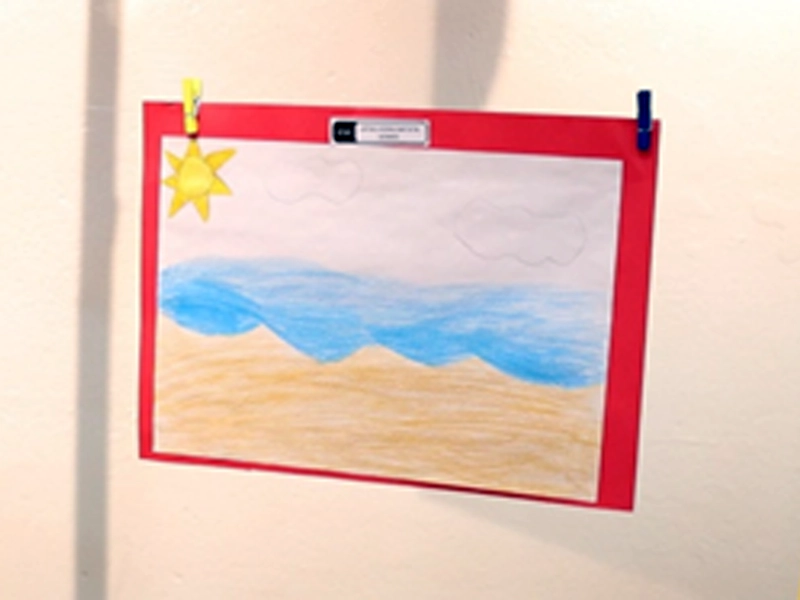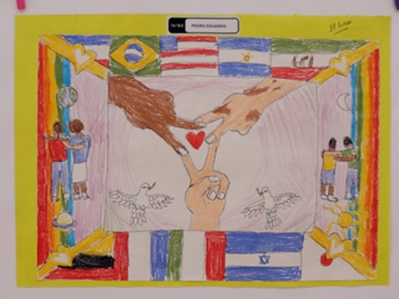 Entre os trabalhos expostos, estava o cartaz da aluna Laysa Vieira, do 6º ano. Ela retratou uma praia como símbolo de paz. “Quando pensei em paz, lembrei da praia. É o lugar onde me sinto tranquila, ouvindo o som do mar. Quis desenhar isso para mostrar que a paz pode estar nas coisas simples,” contou a estudante.