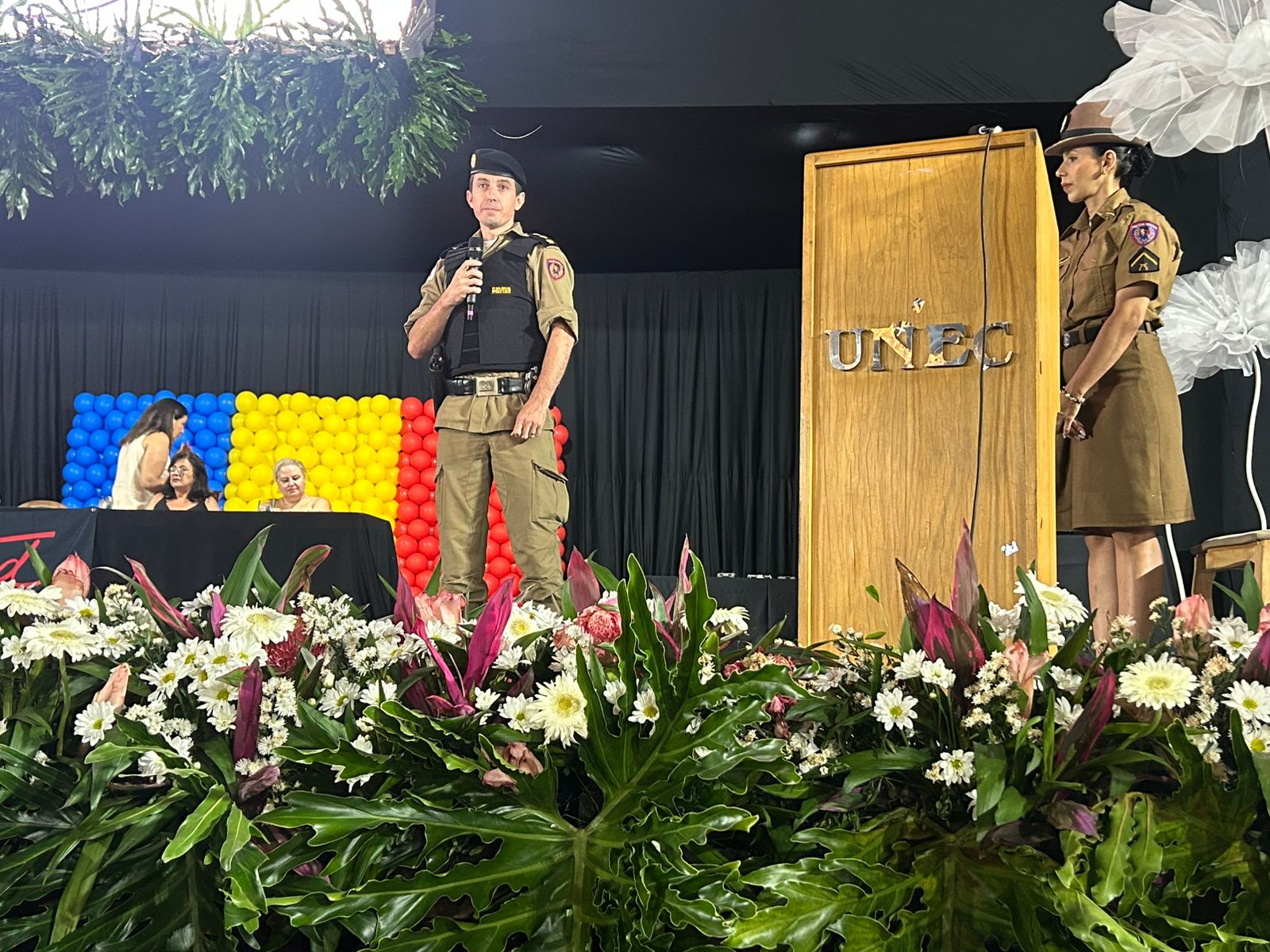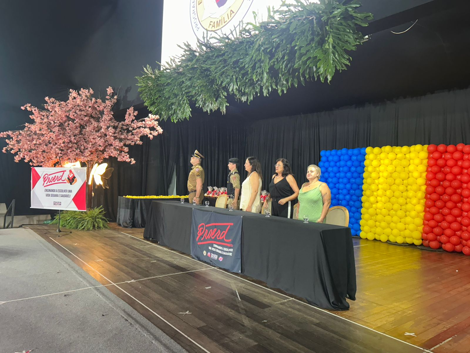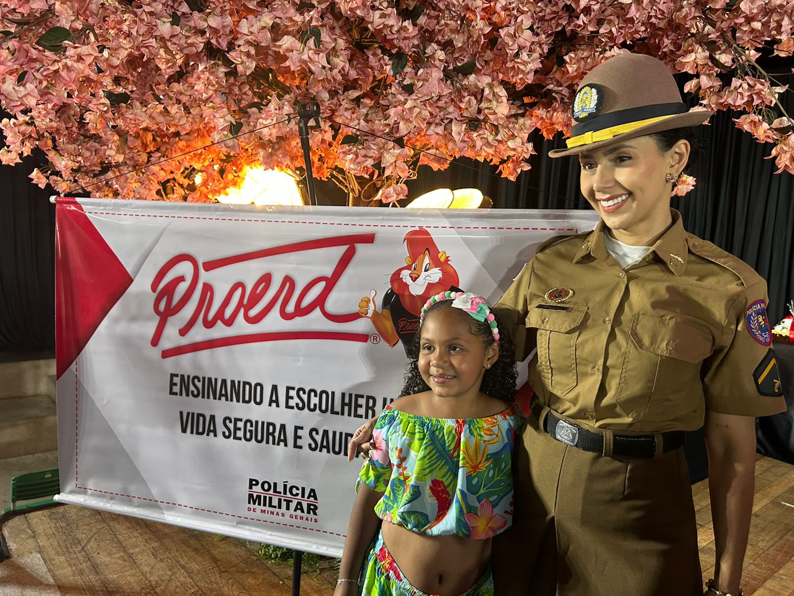 CARATINGA – Na noite desta segunda-feira (9), o Centro de Convenções Dário Grossi, em Caratinga, foi palco da emocionante formatura dos alunos do 5º ano do PROERD – Programa Educacional de Resistência às Drogas. A solenidade, realizada às 19h, marcou o encerramento de mais uma etapa do programa conduzido pela Polícia Militar de Minas Gerais.