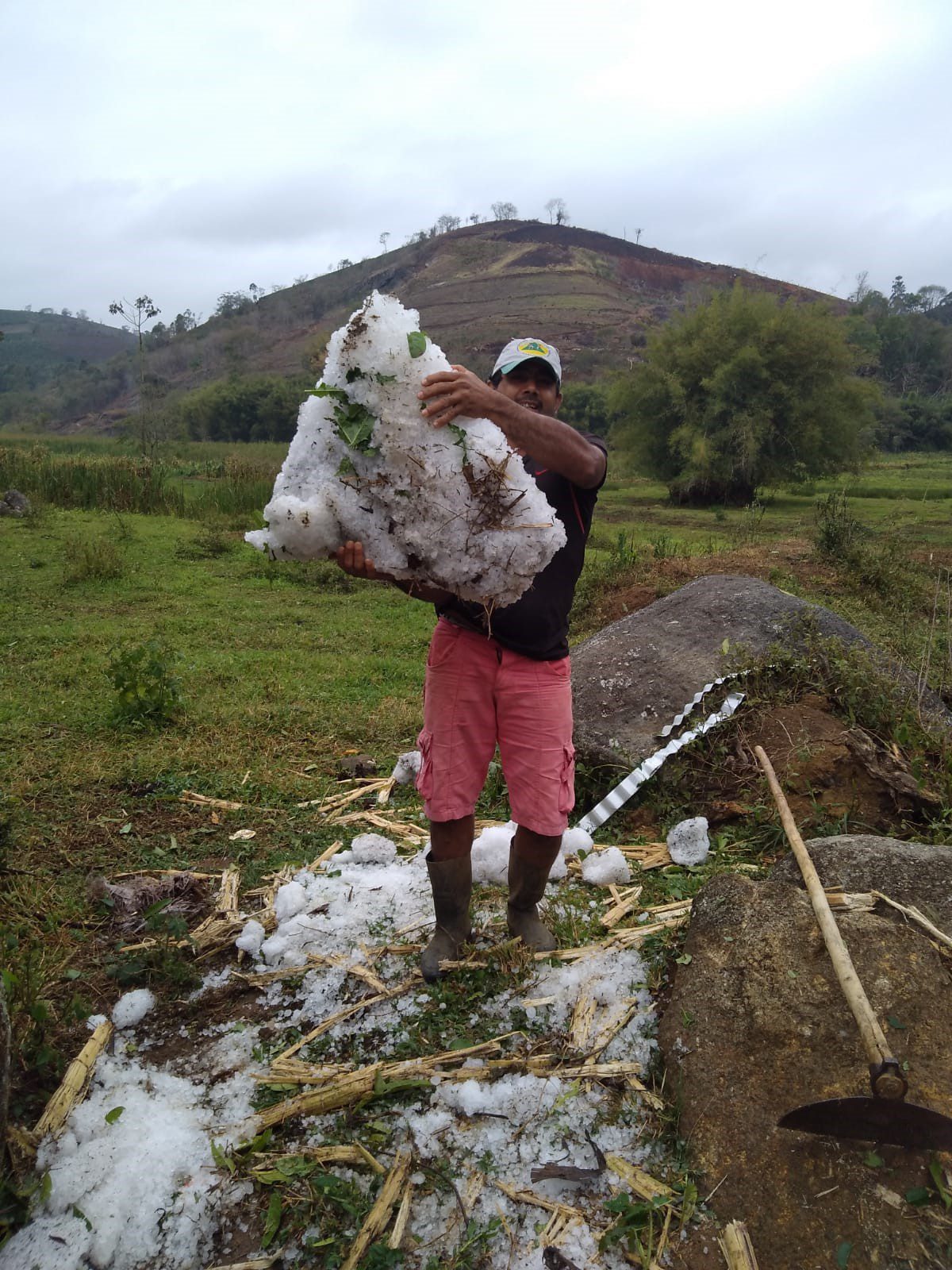 Ele reitera os transtornos enfrentados, mas, se demonstra grato pelo fato do granizo não ter provocado danos maiores. “A lavoura pra nós é o maior estrago, mas, graças a Deus, em bens materiais, outras coisas não tivemos. Teve algum pequeno estrago em telha, essas coisas, mas não foi coisa exagerada. Infelizmente foram as lavouras, todas as plantações, falamos o café, mas, quem tinha pasto aqui acabou, horta não sobrou nada. Pra nós é o maior prejuízo porque a renda nossa é a produção”.