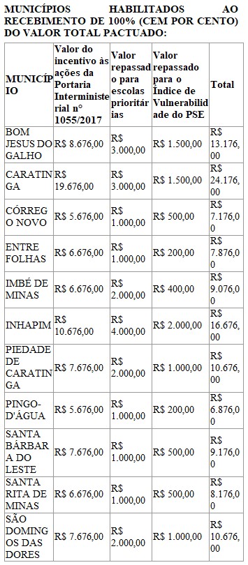 Municípios podem receber R$ 1 mil a mais a cada grupo de 1 a 800 estudantes das creches públicas e conveniadas do município, escolas rurais, escolas com alunos em medida socioeducativas e escolas que tenham, pelo menos, 50% dos alunos matriculados pertencentes a famílias beneficiárias do Programa Bolsa Família. O recurso poderá ser utilizado para aquisição de materiais de consumo que, em razão de seu uso corrente, perde normalmente sua identidade física e/ou tem sua utilização limitada a dois anos. A portaria publicada lista os municípios habilitados para o recebimento do teto de recursos pactuados em Termo de Compromisso do PSE assinado por municípios e Distrito Federal.