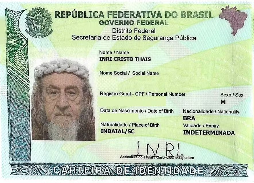 Com a mudança, ele fez uma nova carteira de identidade, assina como “Inri” e aparece com uma coroa de espinhos de plástico na foto três por quatro. Como ele tem mais de 65 anos, o documento não possui prazo para expirar.