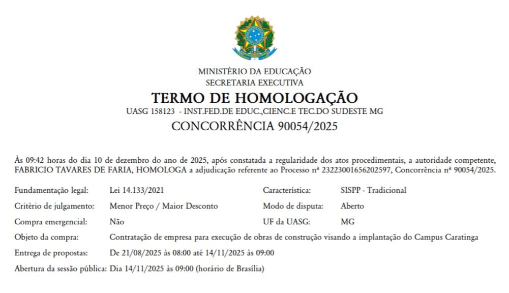 CARATINGA – Foi homologado nesta quarta-feira (10) o resultado da licitação para a construção do Campus Caratinga do Instituto Federal do Sudeste de Minas Gerais (IF Sudeste MG). A empresa O K Empreendimentos Construções e Serviços Ltda. venceu a Concorrência nº 90054/2025 com proposta final de R$ 16.321.628,96.