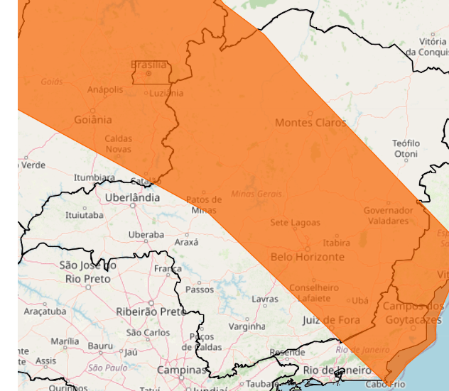 O alerta laranja indica chuvas entre 30 e 60 mm/h ou 50 e 100 mm/dia, acompanhadas de ventos intensos de 60 a 100 km/h.