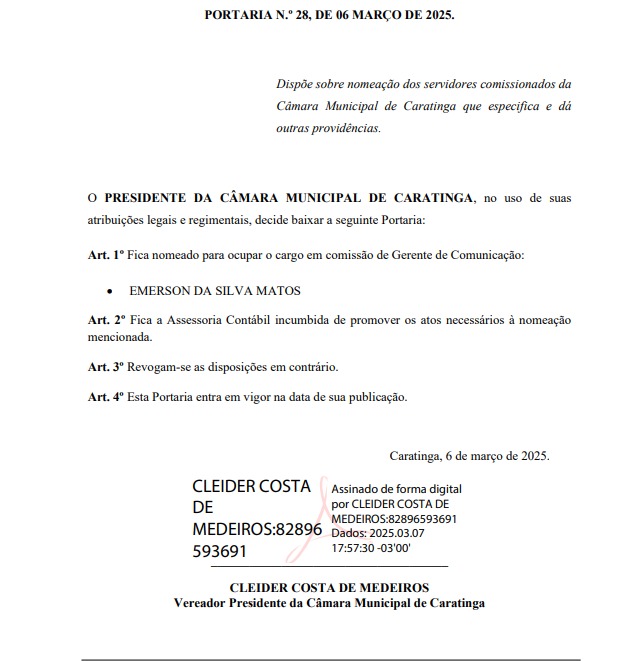 CARATINGA – Em portaria de número 28, de 6 de março de 2025, Cleider Costa de Medeiros, o ‘Cleidinho’, nomeou Emerson da Silva Matos, o ‘Irmão Emerson’, como ‘gerente de comunicação’.