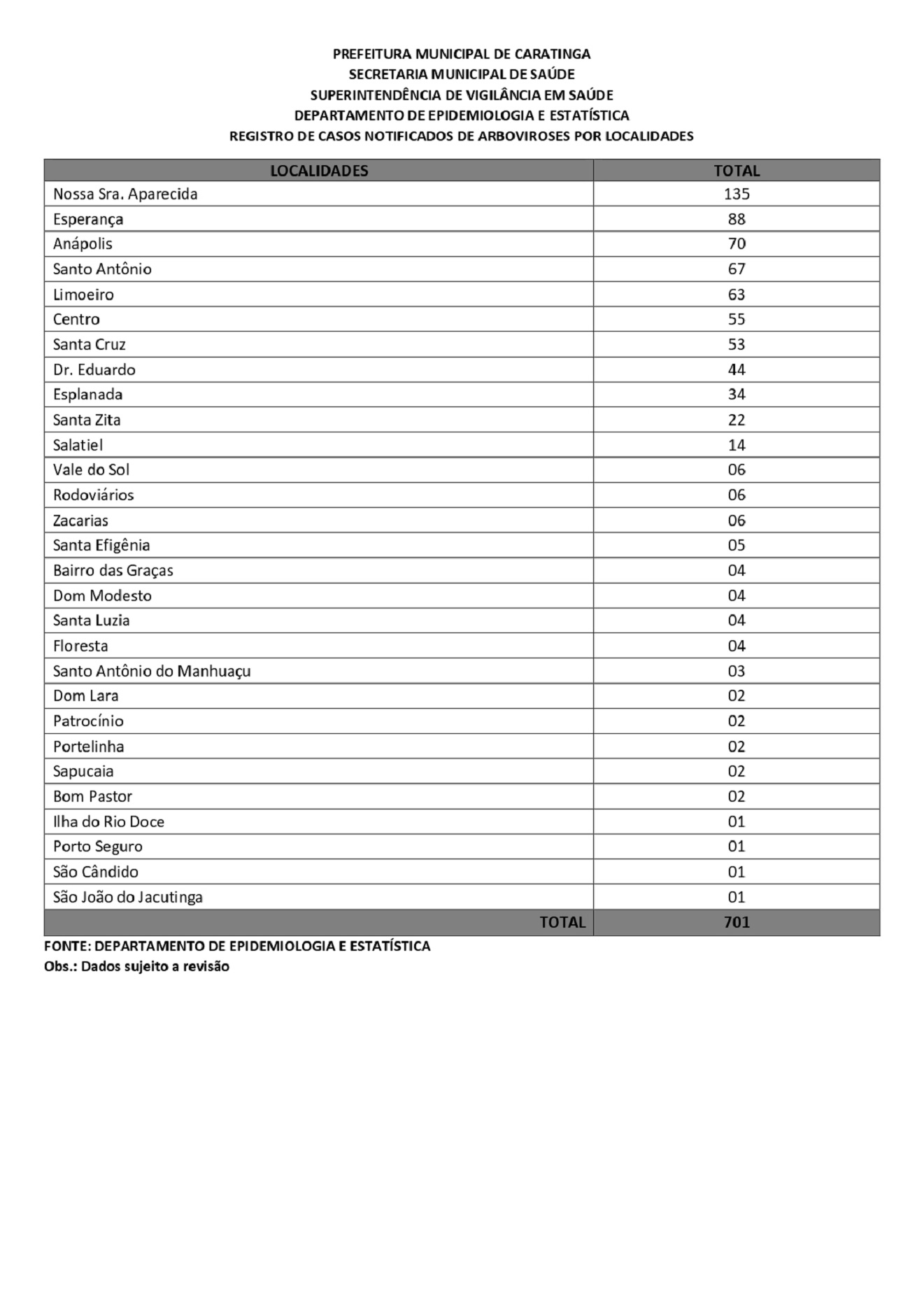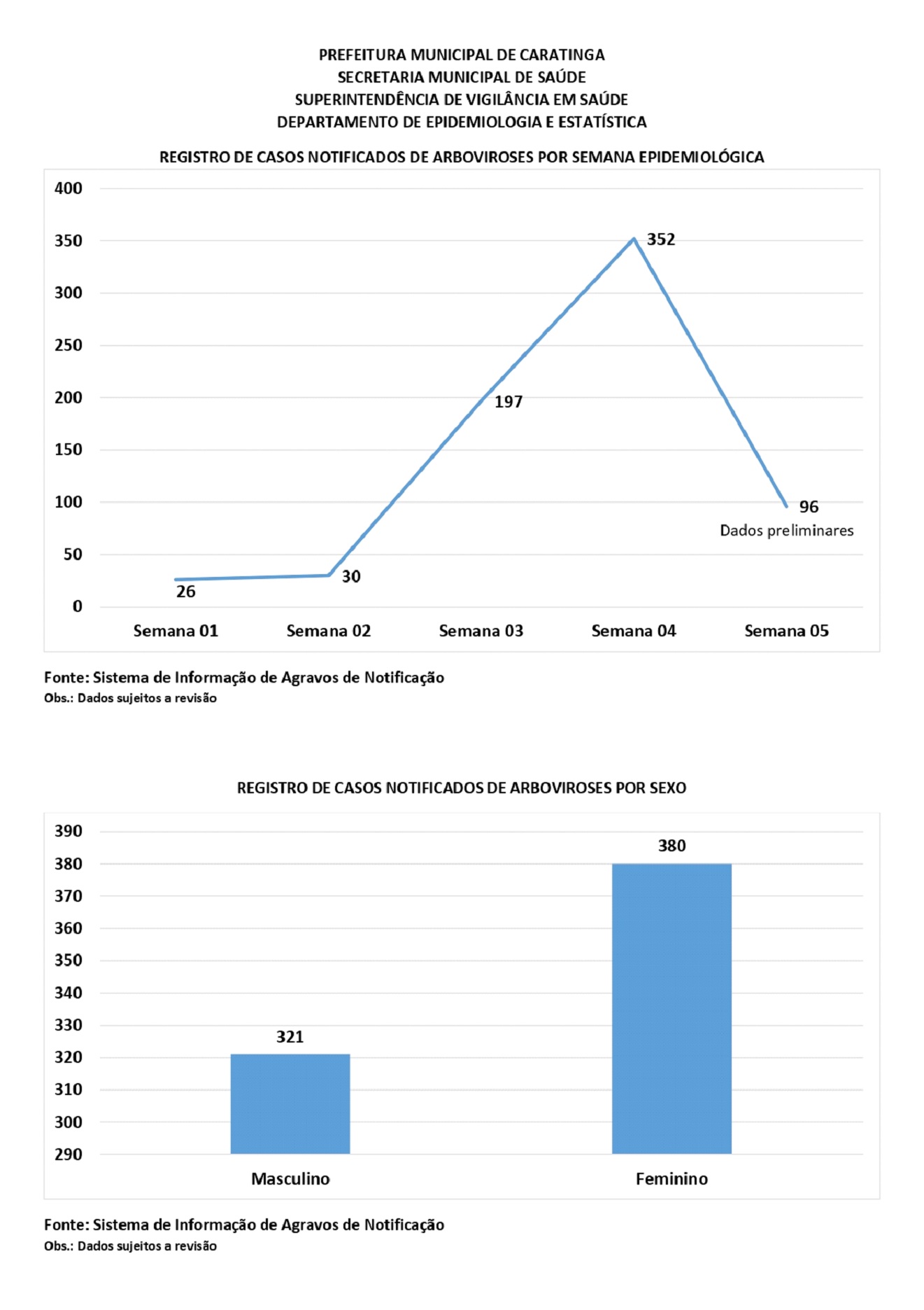 CARATINGA- A Secretaria Municipal de Saúde, por meio da Superintendência de Vigilância em Saúde, divulgou nesta quinta-feira (01/02), o Perfil Epidemiológico das Arboviroses no município referente a janeiro de 2024.