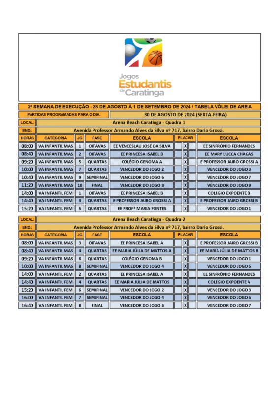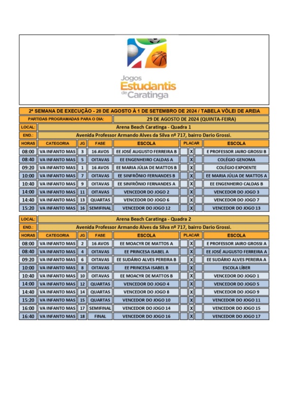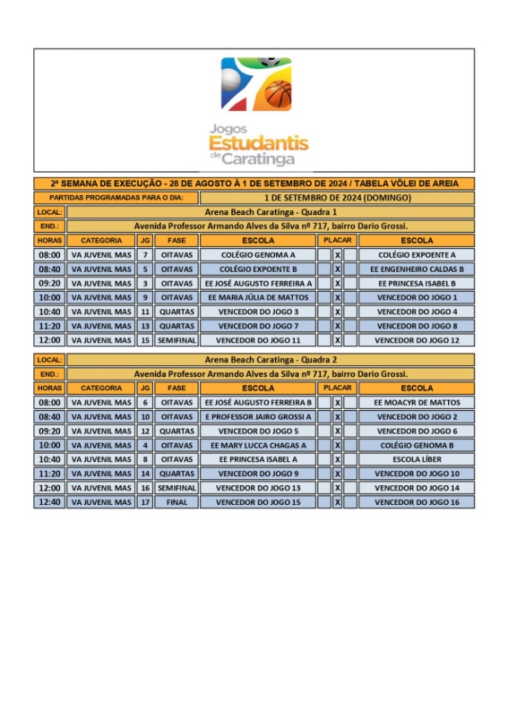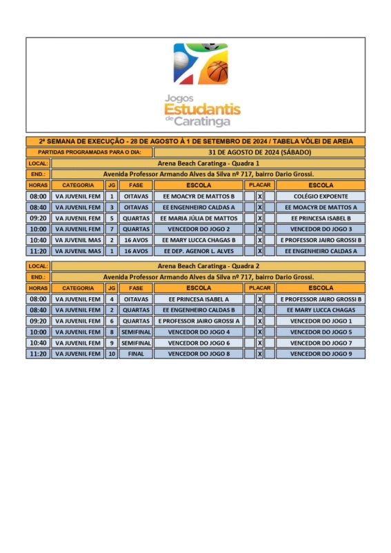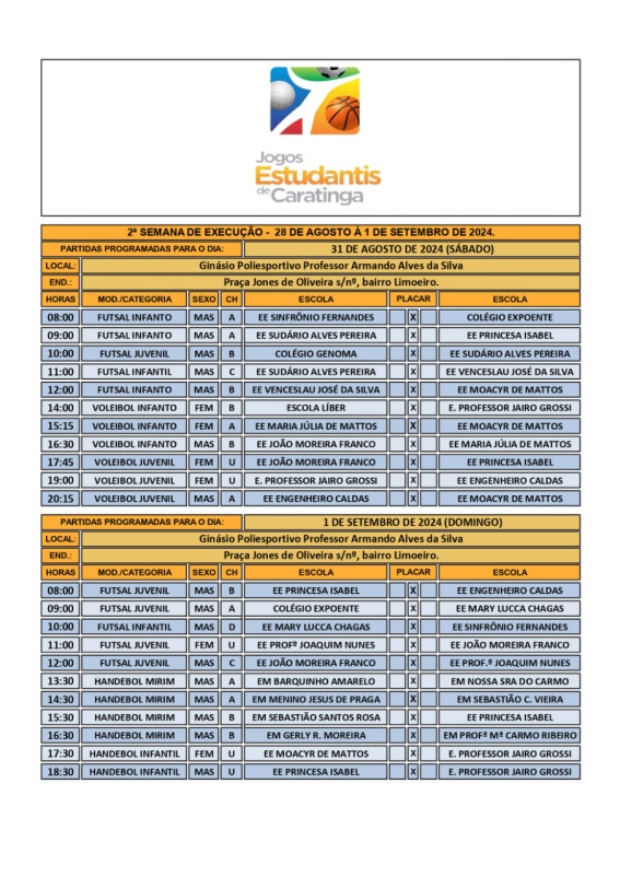 CARATINGA- Começou a maior e mais tradicional competição escolar de Caratinga e região – os Jogos Estudantis. Em 2024, 48 escolas das redes municipal, estadual e privada de ensino disputam 13 modalidades esportivas: Atletismo, Basquete, Dama, Futevôlei, Futsal, Handebol, Natação, Peteca, Queimada, Tênis de Mesa, Vôlei de Areia, Voleibol, Xadrez.