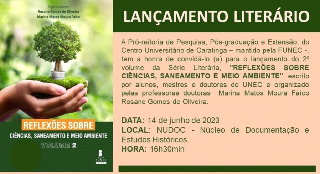 CARATINGA – Será lançado às 16h40 desta quarta-feira (14), o livro ‘Reflexões sobre Ciências, Saneamento e Meio Ambiente’. A obra é de autoria e coordenada pelas professoras e pesquisadoras Rosane Gomes de Oliveira e Marina Matos Moura Faíco. A solenidade de lançamento acontecerá no Espaço do Núcleo de Documentação e Estudos Históricos da UNEC, situado à avenida Moacir de Mattos, nº291, fundos, Centro de Caratinga.