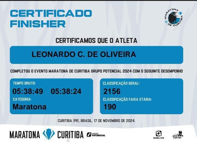 Leo correu os 42 km com o tempo de 5 horas, 38 minutos e 49 segundos, obtendo a classificação geral em 2.156 e na faixa etária em 190. Apesar do clima desafiante de bastante calor, o atleta celebra os resultados, dentre 13 mil atletas.