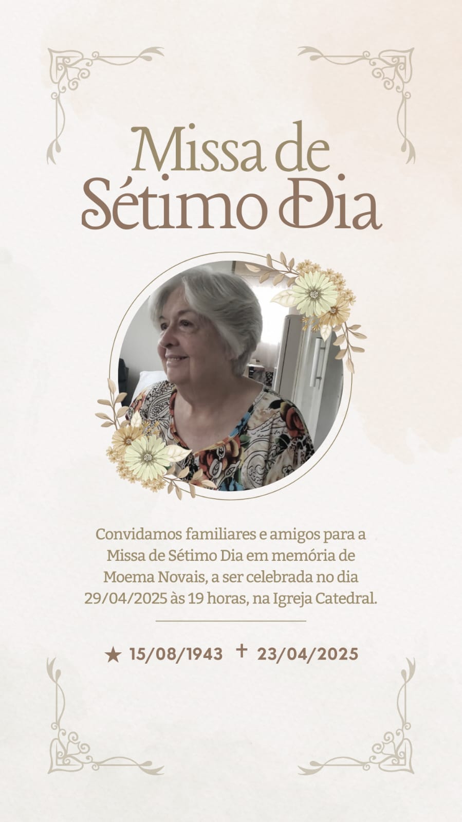 Com o coração ainda marcado pela saudade, convidamos familiares, amigos, ex-alunos e todos que conviveram com Moema Novais, para a Missa de Sétimo Dia em sua memória.