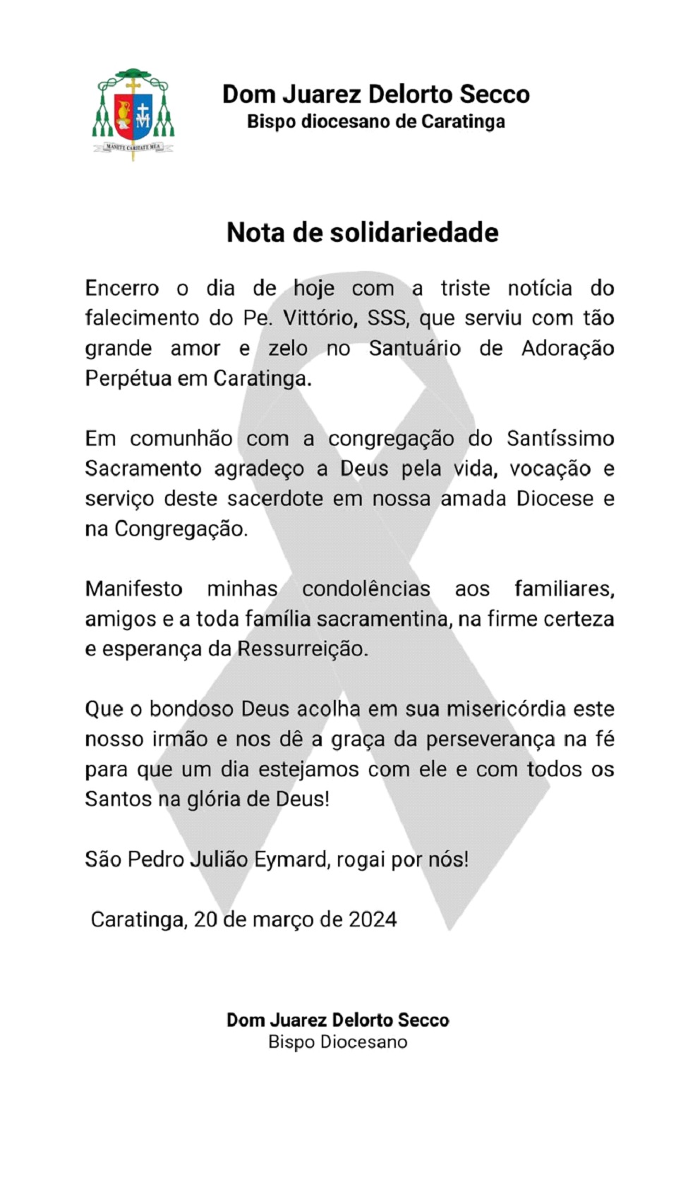 “É com profunda tristeza que nos despedimos do querido padre Vittorio, que serviu com dedicação e amor à comunidade do Santuário de Adoração Perpétua de Caratinga. Sua partida deixa um vazio imenso em nossos corações e na alma desta comunidade que ele tão fervorosamente guiou.
