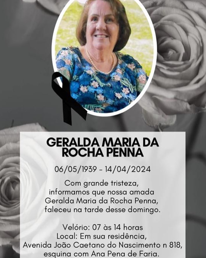 Com pesar, familiares comunicam o falecimento de Geralda Maria da Rocha Penna. O DIÁRIO se solidariza com familiares e amigos.