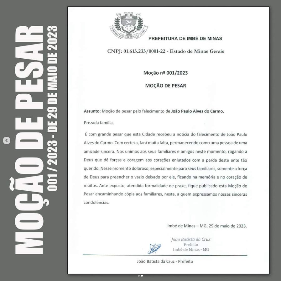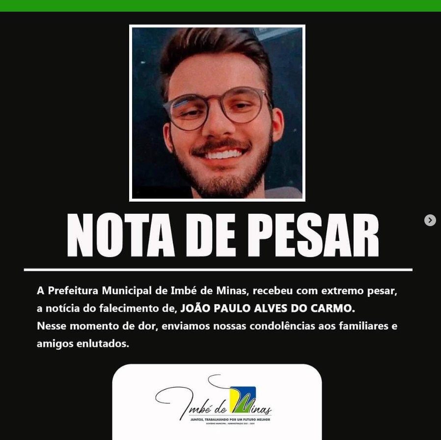 A Prefeitura Municipal de Imbé de Minas, recebeu com extremo pesar, a notícia do falecimento de, João Paulo Alves do Carmo. Nesse momento de dor, enviamos nossas condolências aos familiares e amigos enlutados.