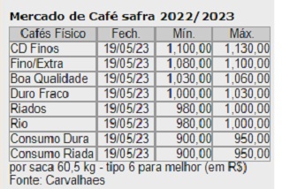 Em reais por saca, os contratos para julho próximo na ICE americana fecharam sexta-feira (19) a R$ 1.268,87. Quinta-feira (18) fecharam a R$ 1,226,60. Na sexta-feira (12) fecharam valendo R$ 1.190,75.