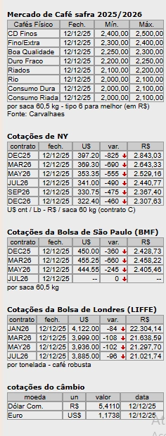 O dólar subiu, na sexta-feira (12), 0,13%, fechando a R$ 5,4110. Fechou a sexta-feira passada (5) a R$ 5,4330 e a sexta-feira anterior à passada (28/11) a R$ 5,3350. Em reais por saca, os contratos para março próximo na ICE Futures US fecharam, sexta-feira (12) valendo R$ 2.643,33. Encerraram a última sexta-feira (5) a R$ 2.693,96 e a sexta-feira anterior à passada (28/11) a R$ 2.690,18. No mercado físico brasileiro, tivemos mais um dia calmo, com as bases de preços dos compradores recuando, acompanhando a queda nas cotações em Nova Iorque. O mercado físico apresentou-se praticamente paralisado. Os produtores não mostram disposição de venda nas bases oferecidas pelos compradores. Há grande interesse comprador para todos os padrões de café.