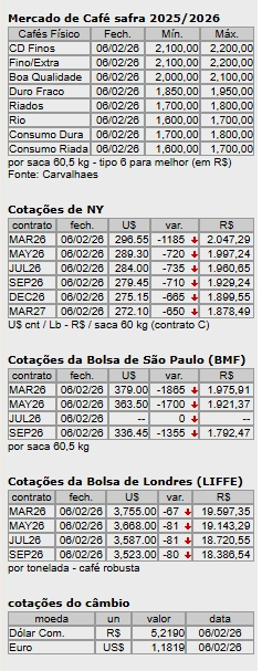 Na ICE Futures US, os contratos para março próximo, oscilaram, sexta-feira (6), 2.135 pontos entre a máxima e a mínima, batendo, na máxima do dia, em US$ 3,1500 por libra peso, em alta de 660 pontos. Fecharam valendo US$ 2,9655 por libra peso, com perdas de 1.185 pontos (3,84%). Na ICE Europe, os contratos de robusta para março próximo, bateram na máxima do dia em 3.882 dólares por tonelada, em alta de 60 dólares. Fecharam o pregão a 3.755 dólares, em queda de 67 dólares (1,75%) por tonelada.
