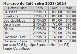 A bolsa de Nova Iorque – ICE, do fechamento do dia 14/7 até o fechamento do dia 21/7, subiu nos contratos para entrega em setembro próximo 105 pontos ou US$ 1,39 (R$ 6,64) por saca. Em reais, as cotações para entrega em setembro próximo na ICE fecharam no dia 14 a R$ 1.019,93 por saca, e, dia 21, a R$ 1.021,48. Ainda na última sexta, nos contratos para entrega em setembro, a bolsa de Nova Iorque fechou em alta de 380 pontos.