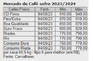 Até dia 4, os embarques de agosto estavam em 120.058 sacas de café arábica, 31.866 sacas de café conilon, mais 2.070 sacas de café solúvel, totalizando 153.994 sacas embarcadas, contra 215.971 sacas no mesmo dia de julho. Até o mesmo dia 4 os pedidos de emissão de certificados de origem para embarque em agosto totalizavam 448.414 sacas, contra 299.048 sacas no mesmo dia do mês anterior.
