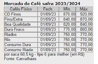 Na ICE Europe, em Londres, os contratos de café para novembro próximo, caíram na sexta-feira (1) 7 dólares e fecharam a US$ 2 482 dólares por tonelada. Quinta-feira (31/8) recuaram 7 dólares e quarta-feira (30/8) subiram 47 dólares. Na terça-feira (29/8), apresentaram ganhos de 12 dólares. Na segunda-feira (28/8) não houve pregão em Londres. Acumularam alta na última semana de 45 dólares. Esses contratos encerraram a sexta-feira anterior, 25/8, a 2 437 dólares por tonelada, somando alta na semana de 74 dólares.