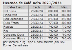 Até dia 22, os embarques de setembro estavam em 1.216.586 sacas de café arábica, 305.744 sacas de café conilon, mais 133.563 sacas de café solúvel, totalizando 1.655.893 sacas embarcadas, contra 1.386.377 sacas no mesmo dia de agosto. Até o mesmo dia 22 os pedidos de emissão de certificados de origem para embarque em setembro totalizavam 1.882.751 sacas, contra 1.743.937 sacas no mesmo dia do mês anterior.