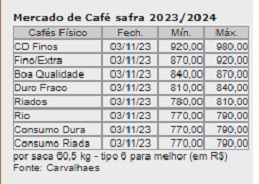 Até dia 3, os embarques de novembro estavam em 1.640 sacas de café arábica, 14.000 sacas de café conilon, totalizando 15.640 sacas embarcadas, contra 32.065 sacas no mesmo dia de outubro. Até o mesmo dia 3 os pedidos de emissão de certificados de origem para embarque em novembro totalizavam 133.135 sacas, contra 78.343 sacas no mesmo dia do mês anterior.