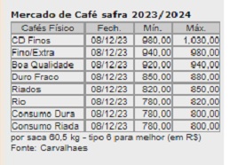 A bolsa de Nova Iorque – ICE, do fechamento do dia 1, sexta-feira, até o fechamento do dia 8, caiu nos contratos para entrega em janeiro próximo 720 pontos ou US$ 9,52 (R$ 46,95) por saca. Em reais, as cotações para entrega em março próximo na ICE, fecharam no dia 1 a R$ 1.190,27 por saca, e dia 8, a R$ 1.155,27. Ainda na última sexta-feira, nos contratos para entrega em março, a bolsa de Nova Iorque fechou em baixa de 35 pontos.