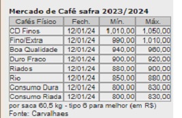 Na segunda semana de 2024, o mercado de café continuou desinteressado, com as bolsas em Nova Iorque e Londres oscilando muito e o mercado físico calmo, praticamente paralisado. As notícias da chegada de chuvas sobre os cafezais brasileiros continuaram pressionando as cotações do arábica na ICE americana. O ataque das milícias Houthis do Iêmen aos navios comerciais que passam pelo Mar Vermelho contribuiu com a forte alta das cotações do robusta em Londres nesta semana. O Mar Vermelho é passagem dos robustas produzidos no Vietnã para grande parte dos mercados desses cafés.