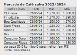 O dólar caiu sexta-feira (3) 0,86 % frente ao real e fechou a semana a R$ 5,0690. Fechou a sexta-feira (29/4) valendo R$ 5,1160. Os preços do café no mercado físico brasileiro subiram fortemente em abril, com as médias dos indicadores Cepea/Esalq do arábica e do robusta aumentando cerca de R$ 200 por saca de 60 quilos em relação ao mês de março. Para o robusta, a média de abril atingiu novo recorde da série histórica do Cepea – Centro de Estudos Avançados em Economia Aplicada da Esalq/USP – iniciada em 2001 para a variedade –, e para o arábica, foi a maior, em termos reais, desde setembro de 2022 (com deflacionamento pelo IGP-DI de março de 2024). No dia 30 de abril, o indicador Cepea/Esalq do café robusta apresentava cotação média de R$ 1.134,67 a saca de 60 quilos, o que representa uma alta mensal de 19,14%. Já o preço médio do arábica estava em R$ 1.247,84 a saca, com aumento acumulado de 21,19% no mês. Em reais por saca, os contratos para julho próximo em Nova Iorque fecharam sexta-feira (3) valendo R$ 1.346,08.