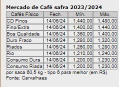 Na ICE Futures US, os contratos de arábica para julho próximo, oscilaram sexta-feira (14) 440 pontos entre a máxima e a mínima, batendo na máxima do dia em US$ 2,2735 por libra peso. Fecharam a US$ 2,2415 por libra peso, em queda de 190 pontos. Na ICE Europe, em Londres, os contratos de robusta para julho bateram sexta-feira (14) em 4.227 dólares na máxima do dia e fecharam valendo US$ 4.115 por tonelada, em baixa de 106 dólares.