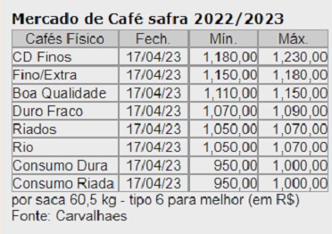 As atenções dos operadores do mercado permanecem firmemente voltadas para a aproximação dos trabalhos de colheita da nova safra brasileira de café e para as diversas estimativas privadas de nossas safras deste ano e de 2024. O Brasil deverá produzir 55,7 milhões de sacas de 60 kg de café em 2023, aumentos de 0,7% em relação ao previsto no mês anterior e de 6,5% em relação a 2022, estimou nesta quinta-feira o IBGE – Instituto Brasileiro de Geografia e Estatística. Para o café arábica, o IBGE estimou 38,5 milhões de sacas de 60 kg, declínio de 0,3% em relação a previsão anterior, mas um aumento de 13,4% ante o ano anterior. Para o café canéfora (robusta e conilon), a estimativa da produção é de 17,2 milhões de sacas, aumento de 2,9% em relação ao mês anterior e declínio de 6,3% em relação ao ano anterior (fonte: Reuters).