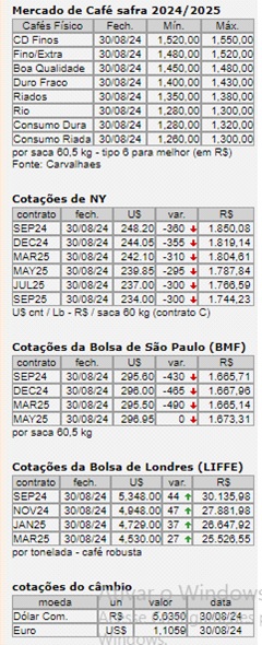 Os contratos de arábica para dezembro próximo na ICE Futures US, na sexta-feira (30/8) oscilaram 955 pontos entre a máxima e a mínima, batendo na máxima do dia em US$ 2,5210 por libra peso, em alta de 450 pontos. Quando o dólar voltou a disparar frente ao real, passaram para o negativo e permaneceram assim até o fechamento. Terminaram o pregão valendo US$ 2,4405 por libra peso, em queda de 355 pontos. Na ICE Europe, em Londres, os contratos de robusta para novembro bateram em 5.180 dólares na máxima do dia e fecharam na última sexta valendo US$ 4.948 por tonelada, em alta de 47 dólares.
