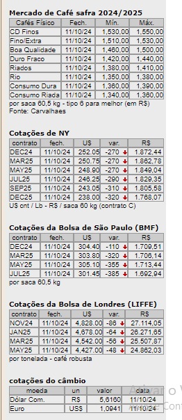 Na sexta-feira (11), os contratos de arábica para dezembro próximo na ICE Futures US, oscilaram 545 pontos entre a máxima e a mínima, batendo na máxima do dia em US$ 2,5645 por libra peso, em alta de 170 pontos. Fecharam o dia valendo US$ 2,5205 por libra peso, em queda de 270 pontos. Os contratos de arábica, com vencimentos em março de 2025 na ICE americana, bateram na sexta em US$ 2,5500 na máxima do dia, e fecharam valendo US$ 2,5075 em baixa de 270 pontos.
