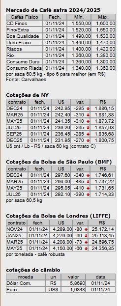 Na sexta-feira (1º), os contratos de arábica para dezembro próximo na ICE Futures US, oscilaram 795 pontos entre a máxima e a mínima, batendo na máxima do dia em US$ 2,4925 por libra peso, em alta de 335 pontos. Fecharam o pregão valendo US$ 2,4295 por libra peso, em baixa de 295 pontos. Na ICE Europe, em Londres, os contratos de robusta para janeiro, bateram em 4.405 dólares na máxima do dia, em alta de 36 dólares. Terminaram o pregão a US$ 4.279 por tonelada, em queda de 90 dólares.