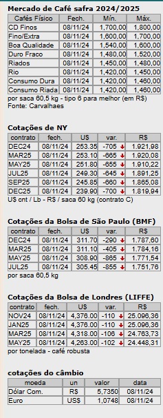 Os contratos de arábica, com vencimentos em março de 2025 na ICE americana, bateram sexta-feira (8) em US$ 2,5935 por libra peso na máxima do dia e fecharam valendo US$ 2,5310 em queda de 665 pontos.