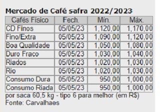 O dólar fechou sexta-feira (5) em queda de 0,96 % frente ao real, a R$ 4,9440. Na sexta-feira anterior, dia 28 de abril, fechou a semana a R$ 4,9870. Em reais por saca, os contratos para julho próximo na ICE americana fecharam hoje a R$ 1229,83. Quinta-feira (4) fecharam a R$ 1208,10. Na sexta-feira (28/4) terminaram o dia a R$ 1 226,68.