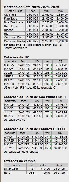 Na sexta-feira (24), na ICE Futures US, os contratos de arábica para março próximo alcançaram novo patamar histórico de preços. Oscilaram 790 pontos entre a máxima e a mínima, batendo na máxima do dia em US$ 3,4980 por libra peso, em alta de 585 pontos. Fecharam o pregão valendo US$ 3,4755 por libra peso, com ganhos de 360 pontos.