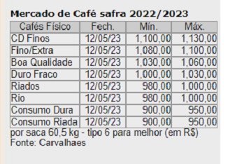 Em reais por saca, os contratos para julho próximo na ICE americana fecharam sexta-feira (12) a R$ 1 190,75. Quinta-feira (11) fecharam a R$ 1 195,11. Encerraram a sexta-feira anterior (5) a R$ 1 229,83. No mercado físico brasileiro, os compradores diminuíram o valor das ofertas ao longo da semana acompanhando a queda em Nova Iorque e do dólar frente ao real. Os produtores se mostram retraídos, mantendo o mercado com poucos negócios realizados, praticamente paralisado.