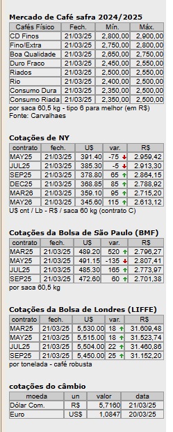 O dólar subiu, sexta-feira (21), 0,72 % frente ao real, fechando o dia a R$ 5,7180. Encerrou a semana passada (14) a R$ 5,7440 e a sexta-feira anterior à passada a R$ 5,9160. Em reais por saca, os contratos para maio próximo na ICE Futures US fecharam hoje valendo R$ 2.959,42. Fecharam a sexta-feira (14) valendo R$ 2.866,03. Encerraram a sexta-feira anterior (7) à passada a R$ 2.944,12.