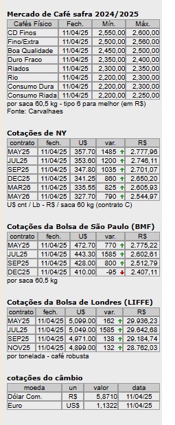 Como temos repetido diariamente, estamos assistindo ao início de profundas mudanças nas regras do comércio global, e por enquanto não é possível enxergar os desdobramentos dessas mudanças no mercado internacional de café. Nossas exportações de café para os EUA são, quase que em sua totalidade, de café verde, que geram para os americanos milhares de empregos e uma espetacular agregação de valor na industrialização e comercialização desses cafés. “Em nossa opinião, com estoques baixos, tanto nos países produtores como nos consumidores, e os problemas climáticos, com eventos extremos, se sucedendo em todo o mundo, os preços do café tendem a se sustentar, mas é preciso aguardar os desdobramentos das negociações sobre a implantação das “tarifas recíprocas”, para uma análise mais segura”, destacou o Escritório Carvalhaes, sediado em Santos/SP.