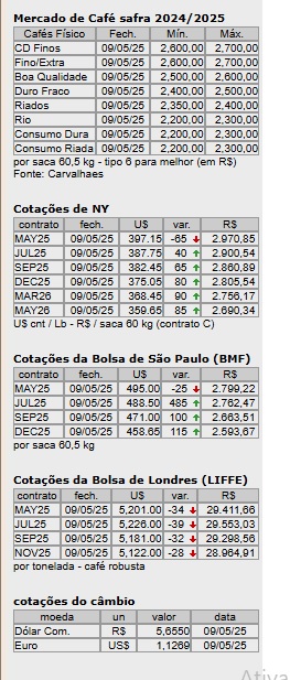 Os contratos de arábica com vencimento em julho próximo na ICE Futures US, em Nova Iorque, oscilaram, sexta-feira (9), 600 pontos entre a máxima e a mínima. Bateram em US$ 3,9120 na máxima do dia, em alta de 385 pontos. Fecharam valendo US$ 3,8775 com ganhos de 40 pontos. Os contratos de arábica, com vencimento no último mês de maio na ICE americana, fecharam valendo US$ 3,9715 por libra peso.